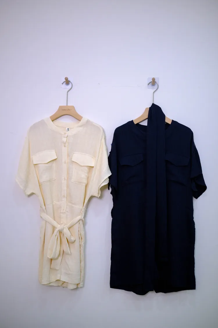 雙口袋綁帶連身褲(米,深藍)