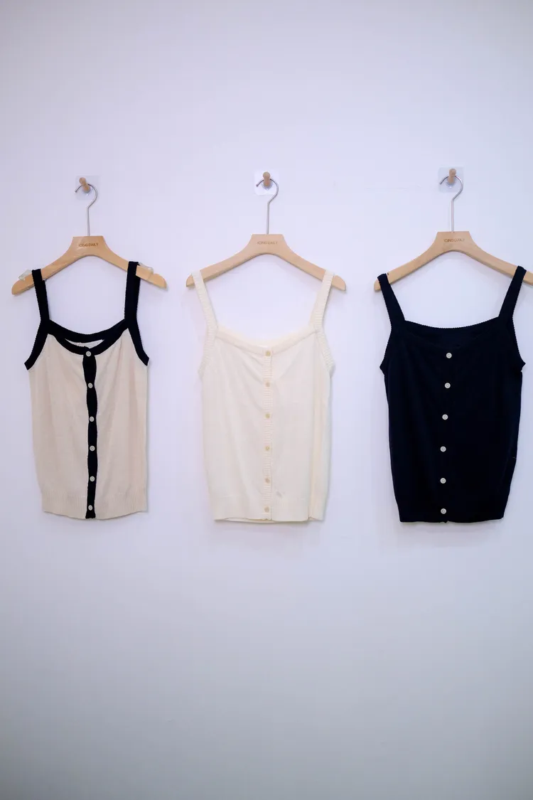 粗肩針織排扣背心(米,撞色,黑)