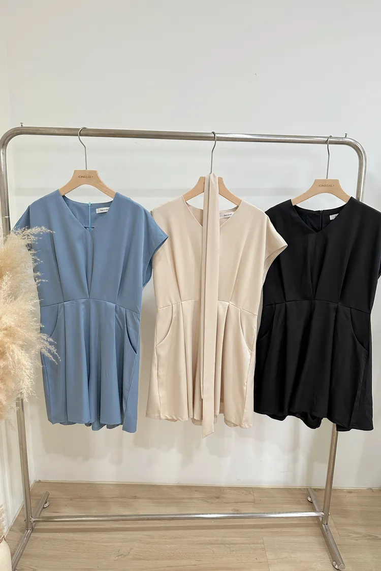 遮袖打摺連身褲(附腰帶)(杏,藍,黑)