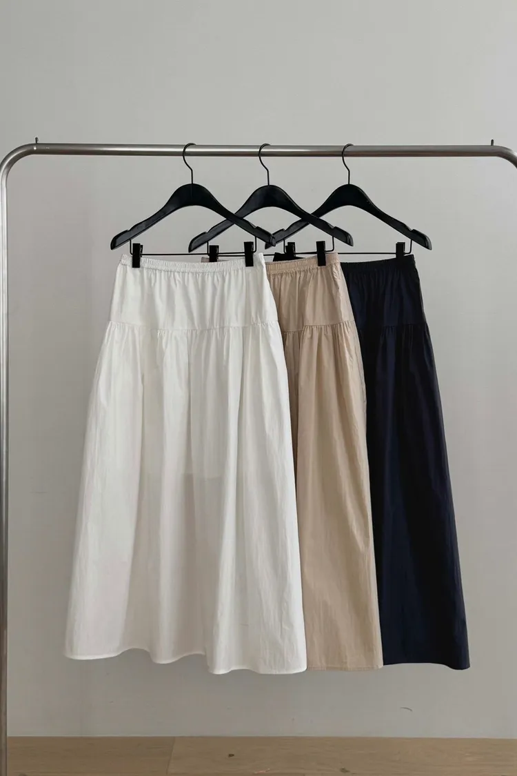 純棉鬆緊車線抓皺裙(白,杏,黑)(S,M,L)