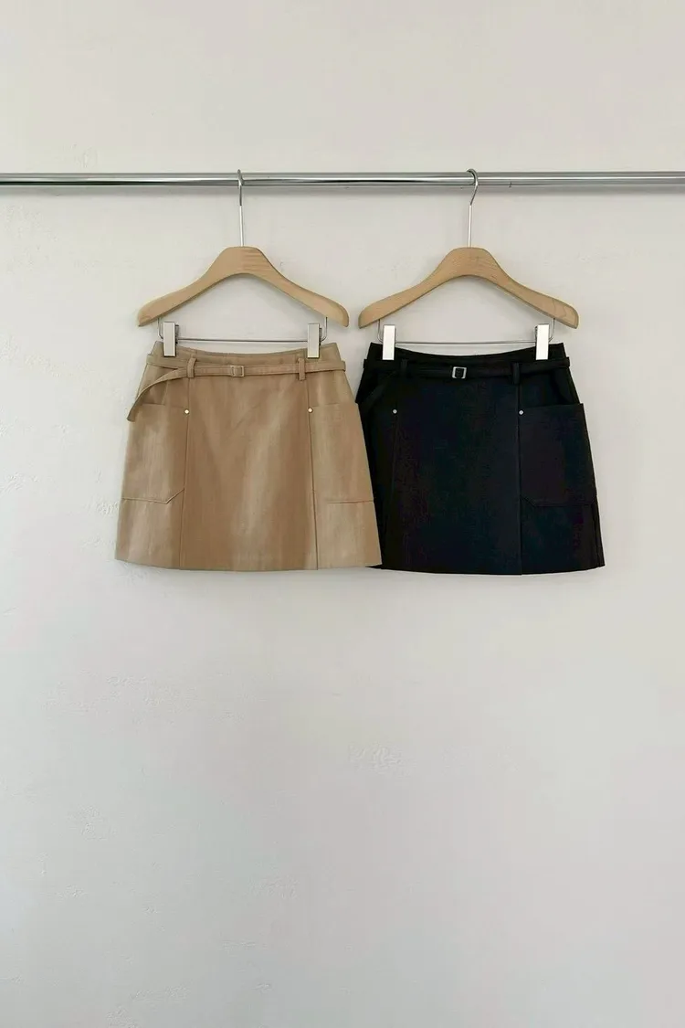 棉100%好看口袋腰帶短裙(咖,黑)(S,M)