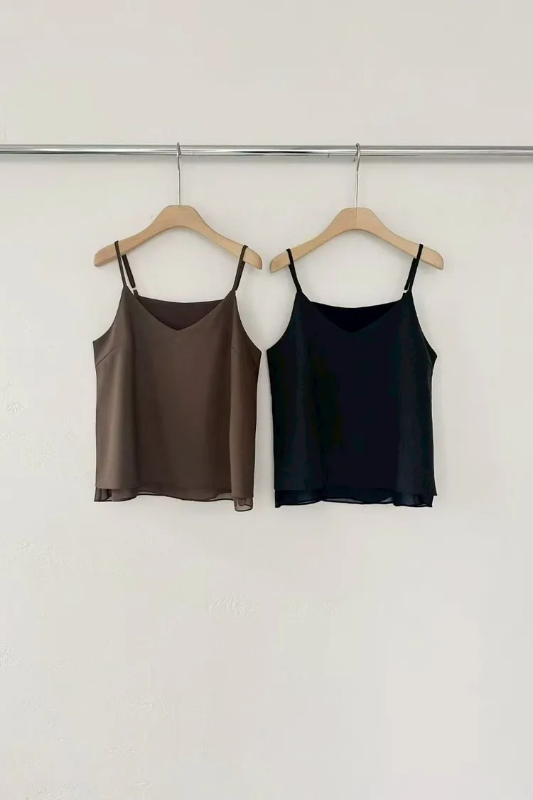 人造絲5%假兩件細肩網紗背心(咖,黑)