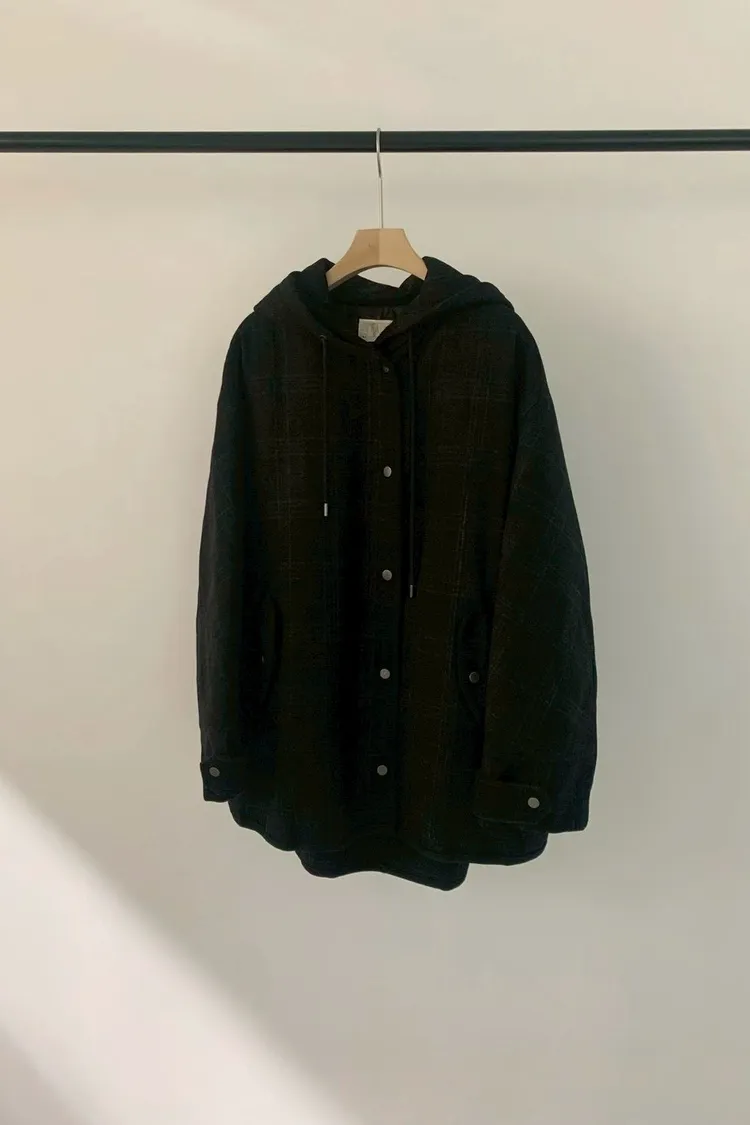 羊毛60%百搭連帽格紋抽繩上衣
