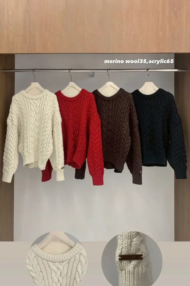 美麗諾羊毛35%麻花圓領上衣(白,紅,咖,黑)