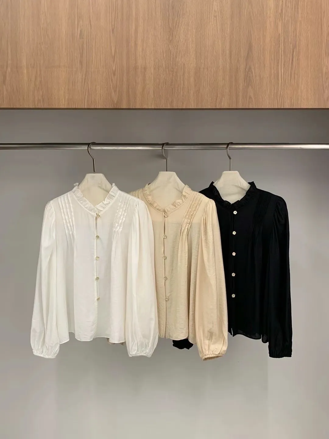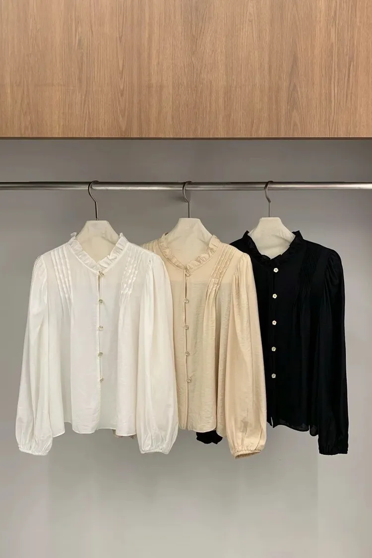 天絲100%荷葉壓摺排扣上衣(白,杏,黑)