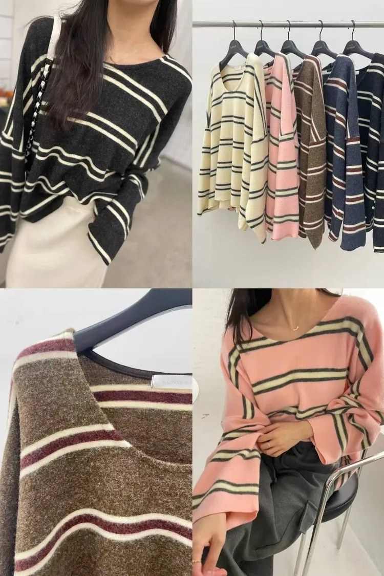 慵懶寬圓領橫條上衣(米,粉,咖,藍,灰)