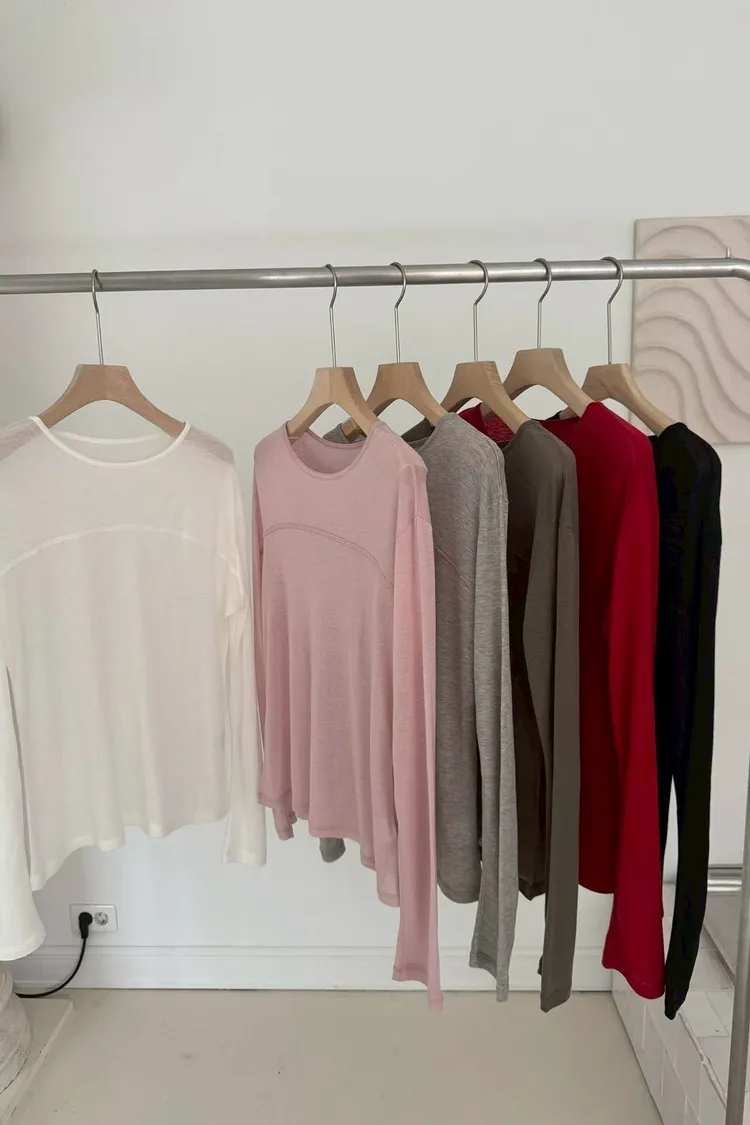 天絲70%羊毛30%透膚車線圓領上衣(白,粉,灰,咖,紅,黑)