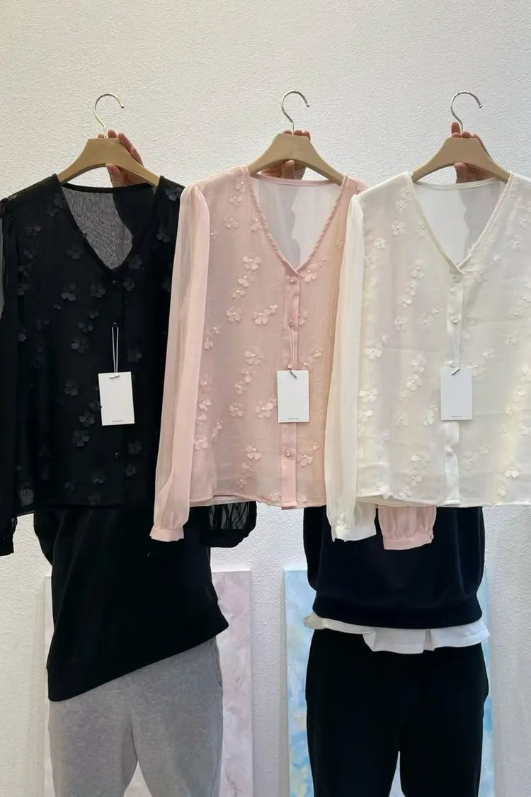 V領花朵排釦上衣(黑,粉,白)