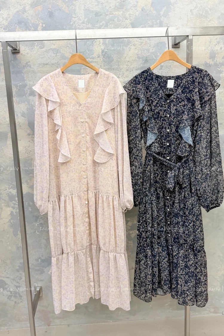荷葉排扣V領洋裝(白,黑)