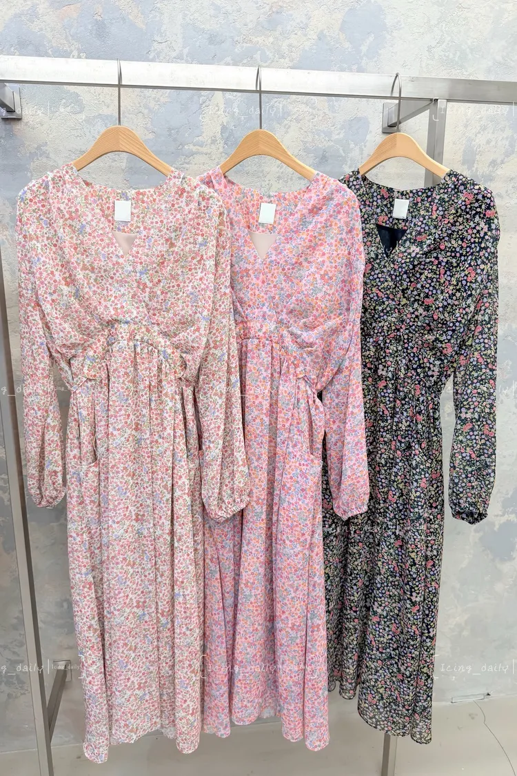 滿版花朵V領洋裝(菊,粉,黑)