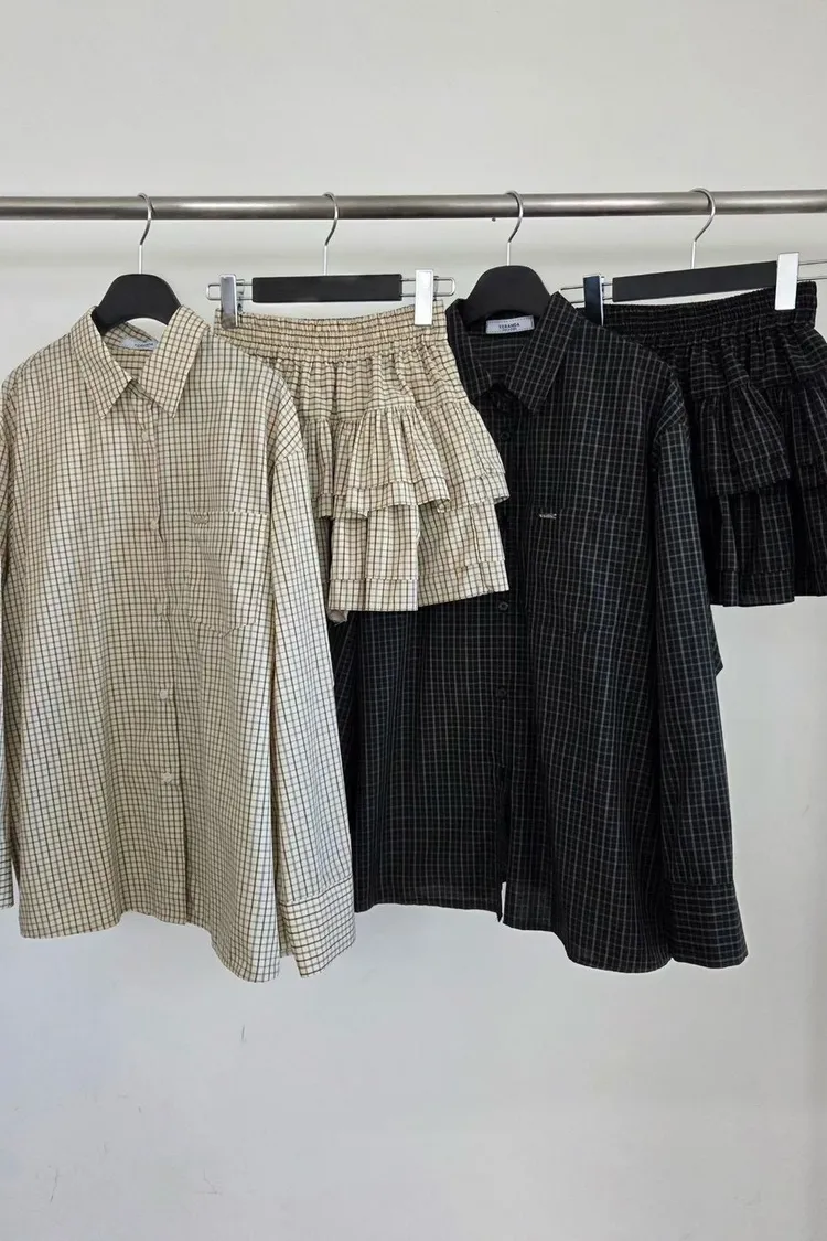 格紋口袋排扣襯衫(杏,黑)