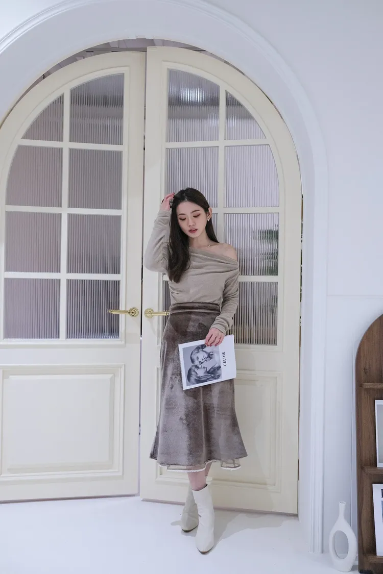 網紗滾邊蕾絲後鬆緊絨布裙(可可/咖)