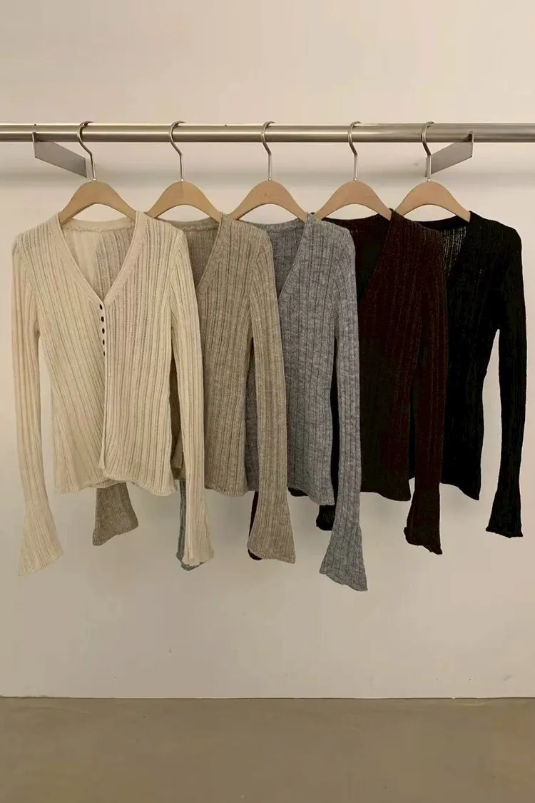 羊毛10%坑條V領上衣(米,杏,灰,咖,黑)