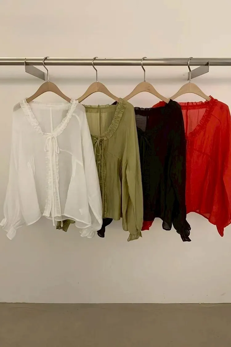 天絲88%木耳邊綁帶透膚上衣(白,綠,黑,紅)