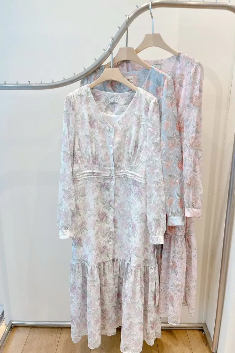打摺V領花朵排釦洋裝(白,藍,粉)