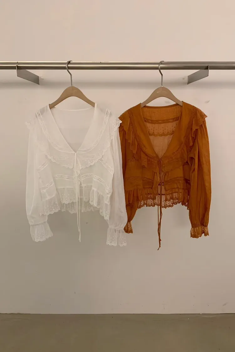 苧麻100%蕾絲綁帶設計上衣(橘,白)