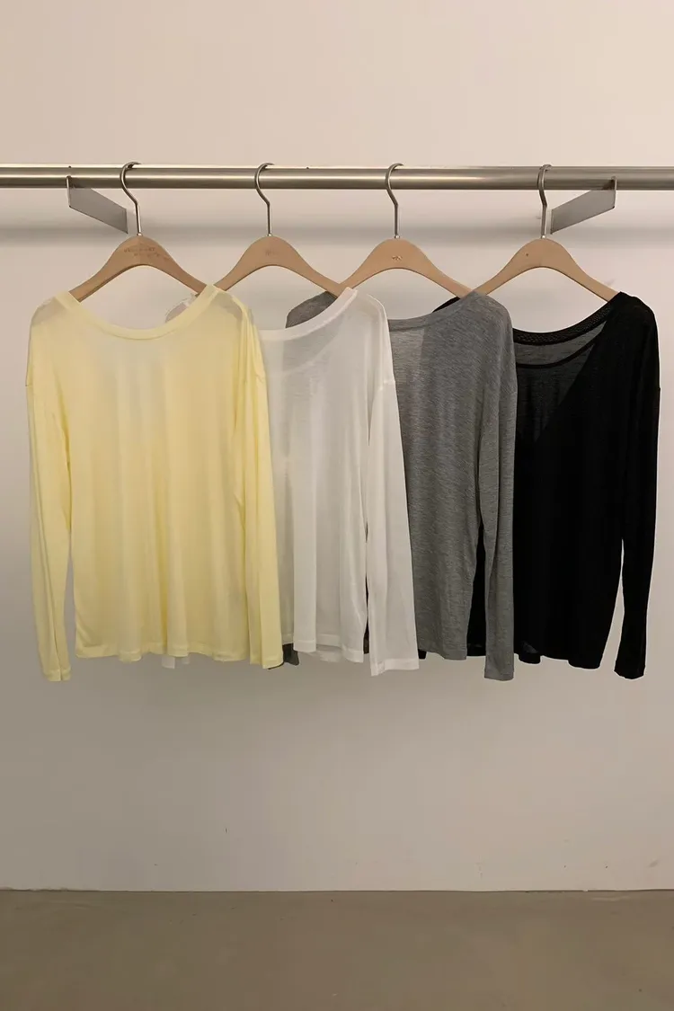 天絲100%輕薄圓領長袖上衣(白,黃,灰,黑)