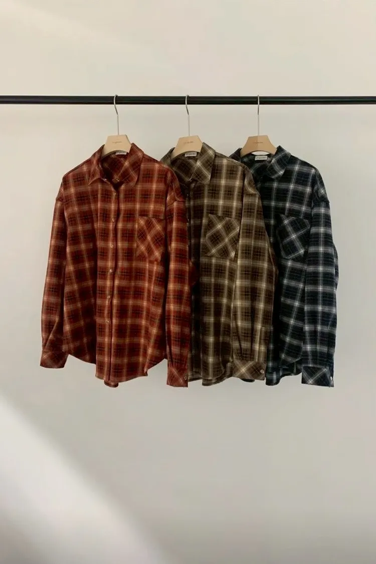 人造絲25%率性格紋口袋襯衫(紅,咖,黑)