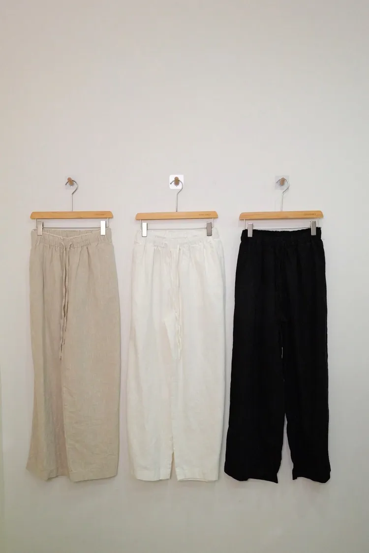 質感抽繩亞麻寬褲(白,杏,黑)
