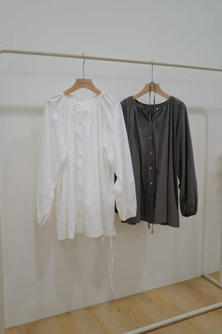 溫柔抓皺排釦綁帶上衣(白,灰)