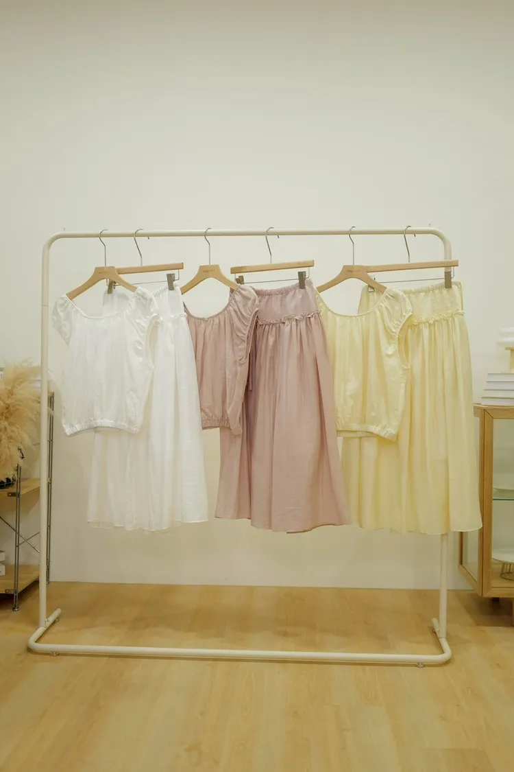減齡抓皺寬肩上衣裙子SET(白,綠,黃,粉)