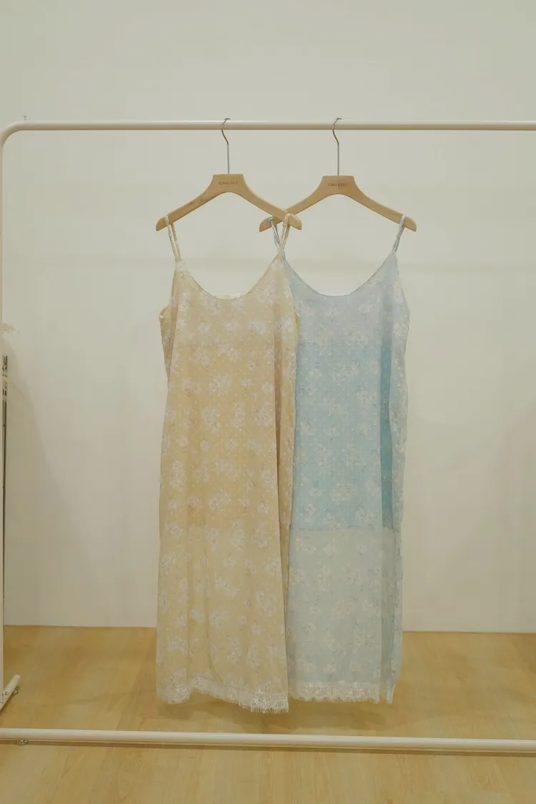 可調整花朵蕾絲洋裝(米,藍)