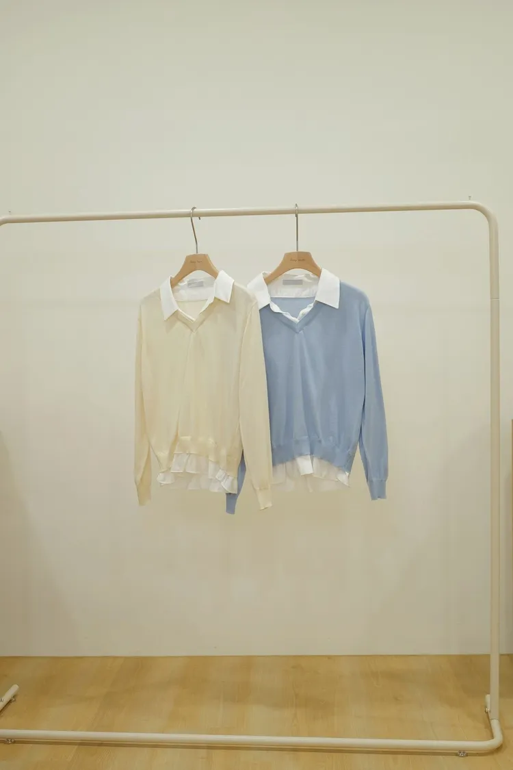 棉假兩件慵懶翻領上衣(米,藍,黑)