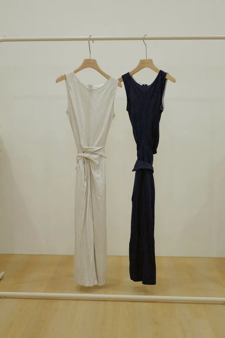 人造絲70%亞麻30%寬肩線條綁帶洋裝(米,藍)