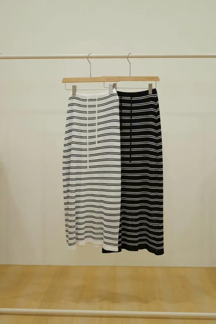 休閒橫條抽繩裙(白,黑)