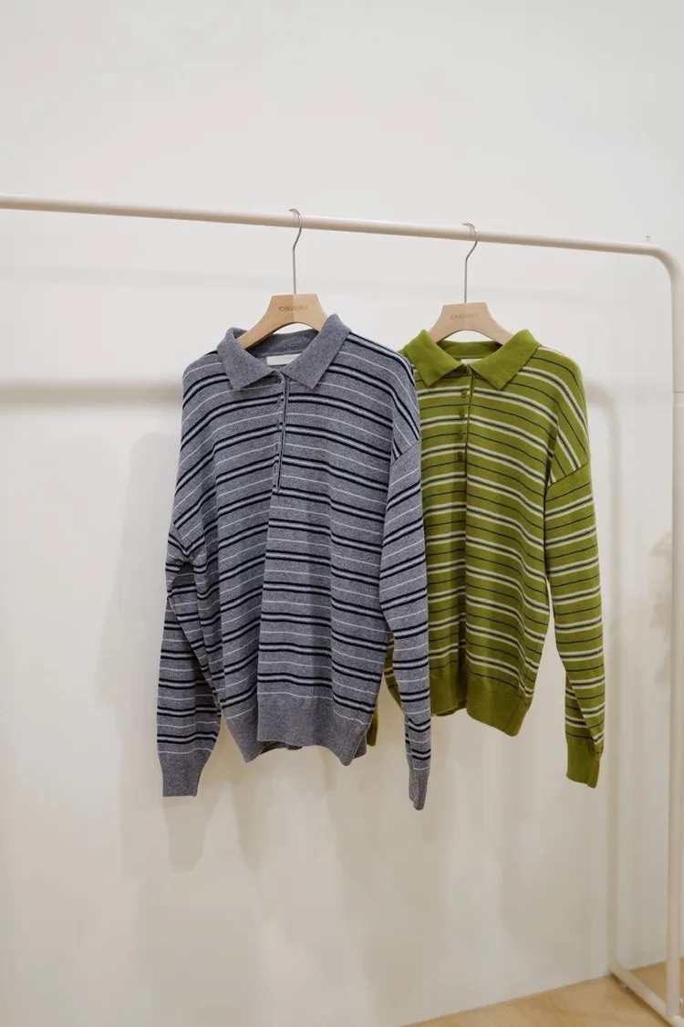 羊毛10%休閒橫條翻領上衣(綠,灰)