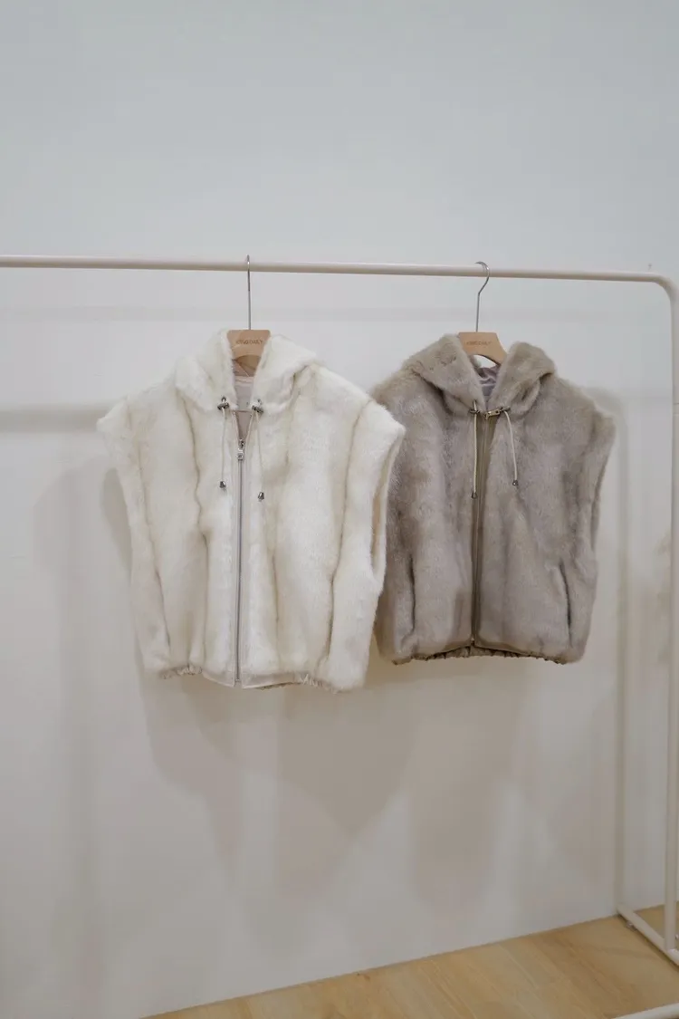 毛毛抽繩拉鏈背心(白,灰)