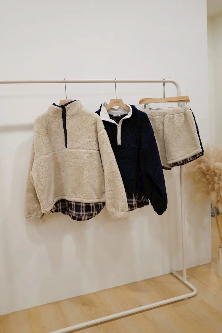 羊毛15%假兩件格紋鬆緊毛毛短褲(米,藍)