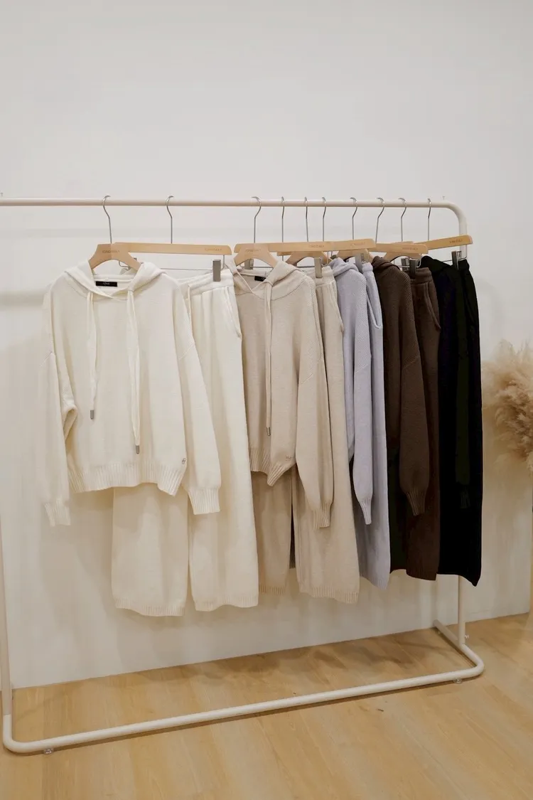 天絲50%美麗諾30%羊絨20%休閒連帽綁帶上衣長褲SET(白,米,灰,咖,黑)