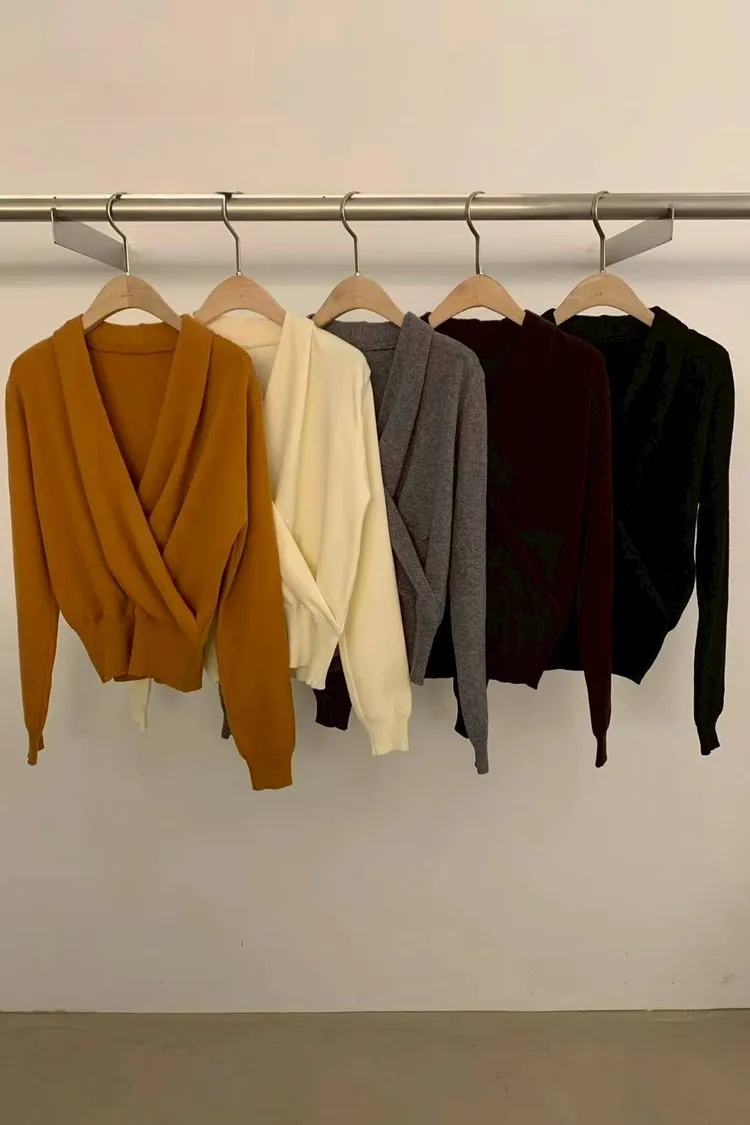 羊毛10%氣質交叉抓皺上衣(橘,白,灰,咖,黑)