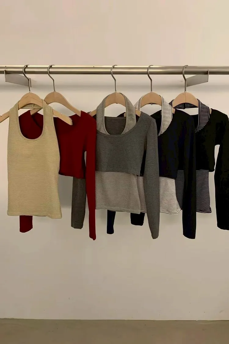 兩件式繞脖橫條背心上衣SET(紅,灰,藍,黑)