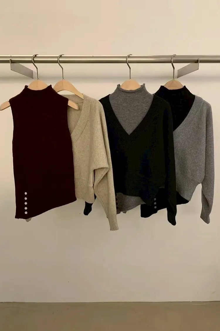 羊毛16%層次兩件式削肩排釦背心上衣Set(杏,灰,藍)