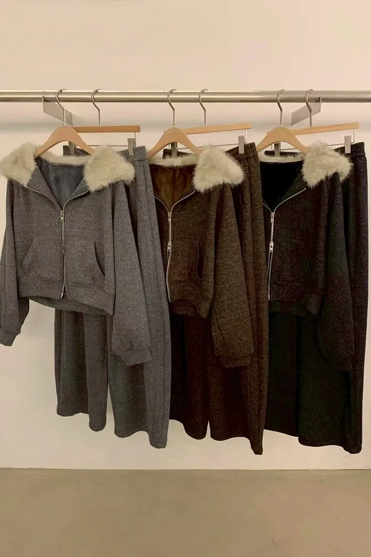 羊毛5%休閒拉鍊毛毛翻領外套長褲SET(灰,咖,黑)