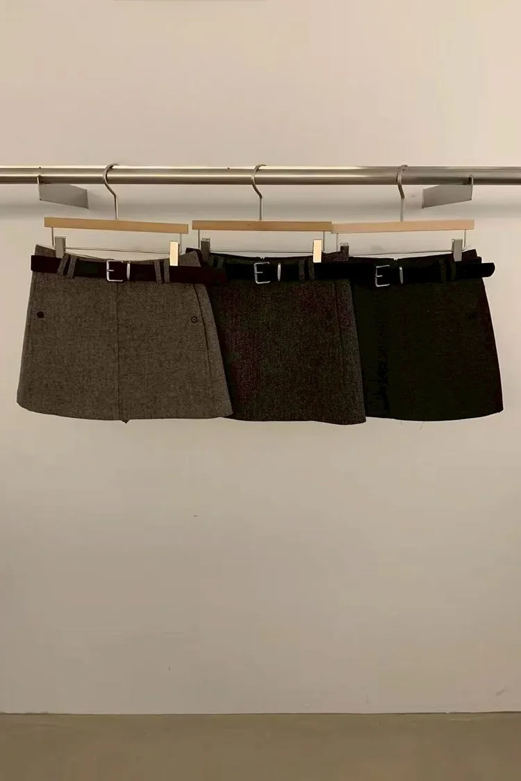 羊毛50%口袋皮帶褲裙(棕,灰,黑)(S,M)