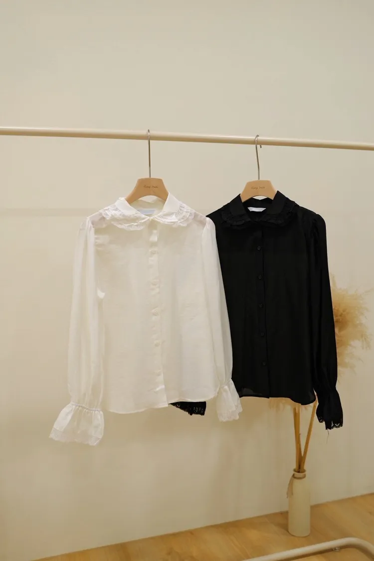 甜美荷葉領襯衫(白,黑)