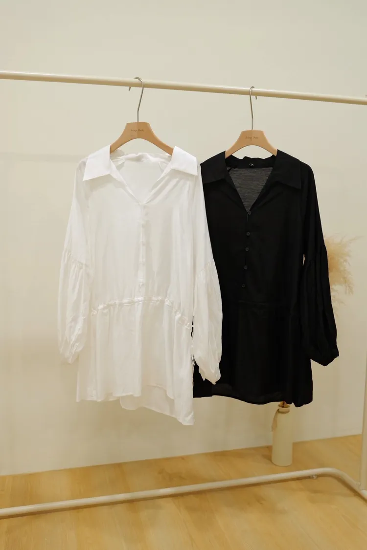 天絲90%造型翻領縮腰襯衫(白,黑)