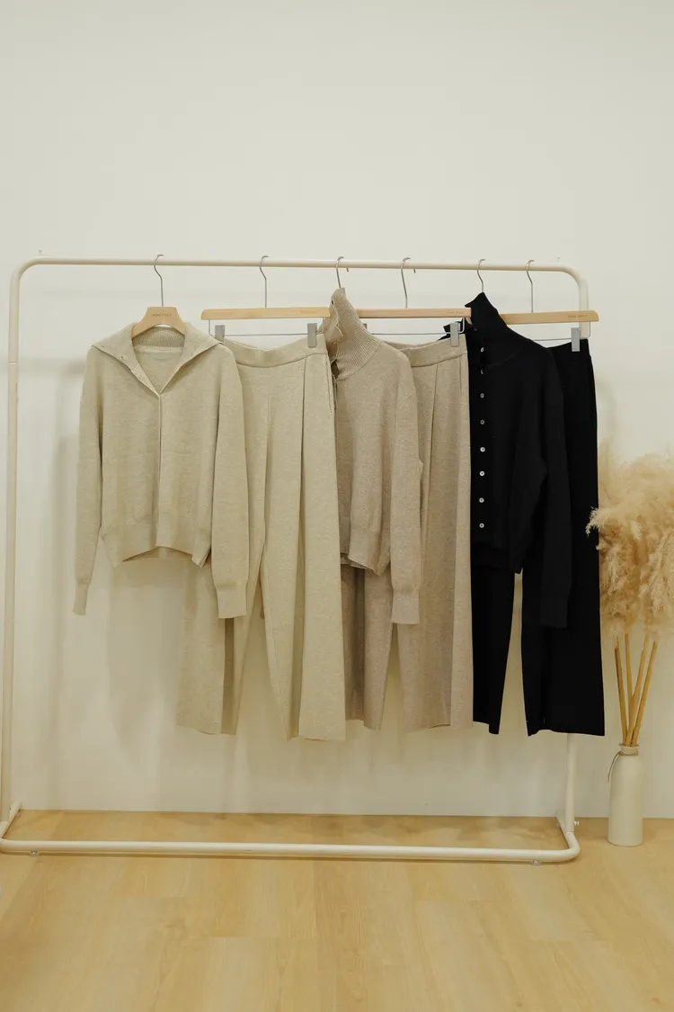 羊絨10%棉50%休閒排釦連帽衣打摺褲SET(杏,可可,黑)