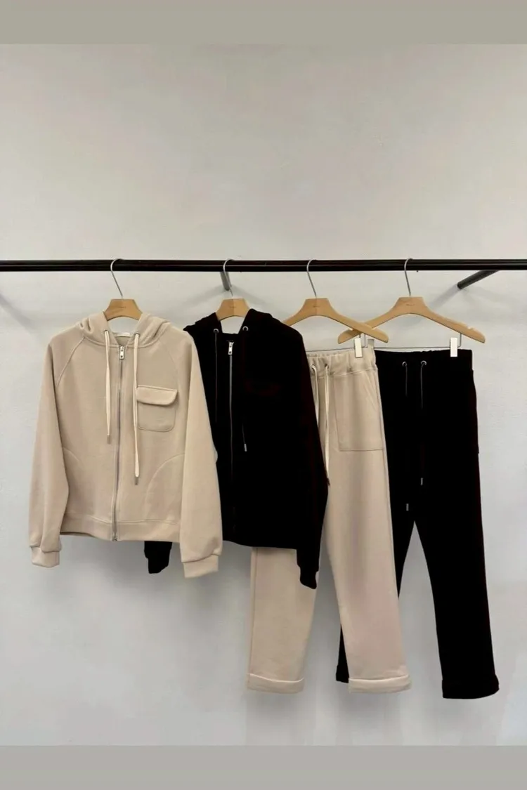 休閒車線拉鍊口袋外套長褲SET(杏,黑)