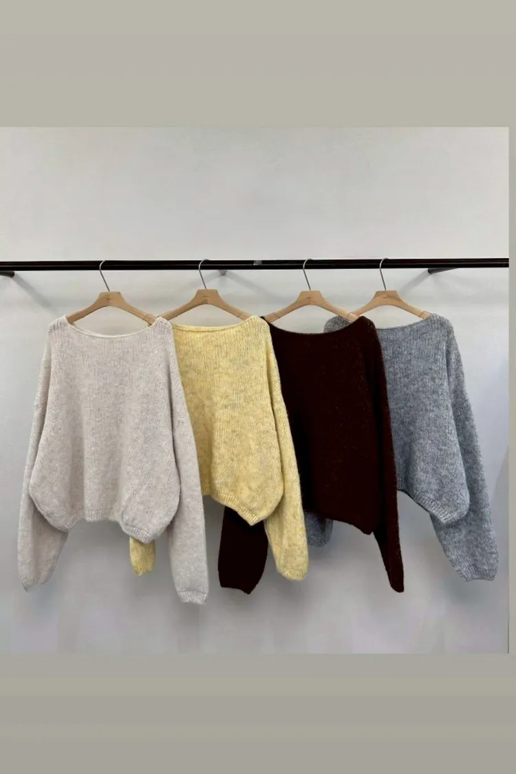 羊毛8%船領慵懶針織上衣(米,黃,咖,灰)