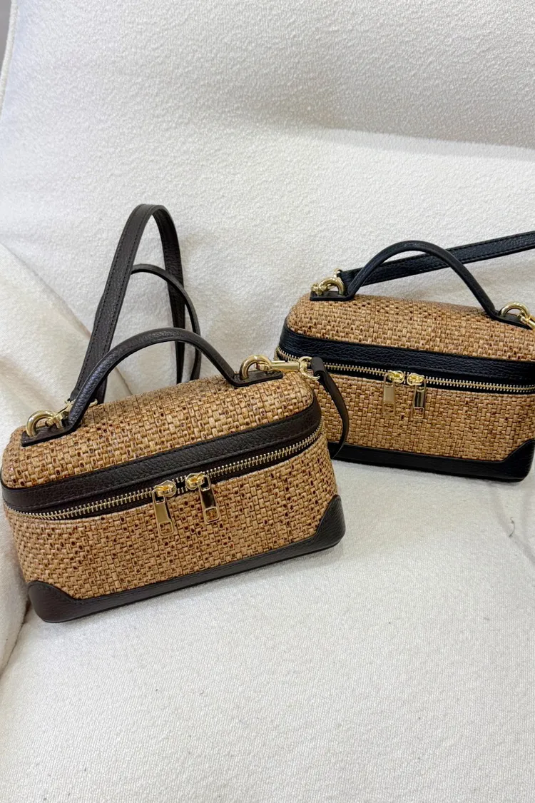 MADE IN ITALY手工義大利牛皮拉菲草去旅行的小箱子感藤編包(咖,黑)