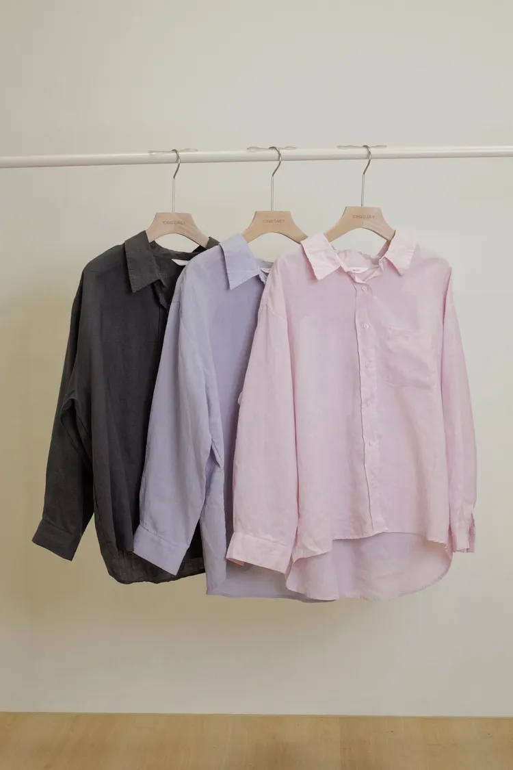 亞麻100%率性翻領口袋襯衫(粉,紫,黑)