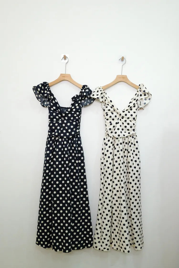 波點V領洋裝(杏,黑)
