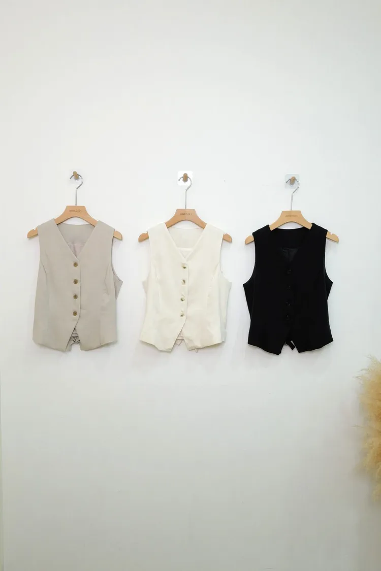寬肩排扣V領背心(米,杏,黑)