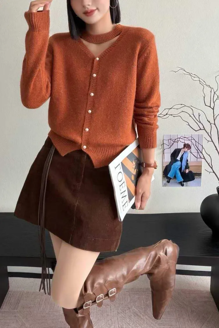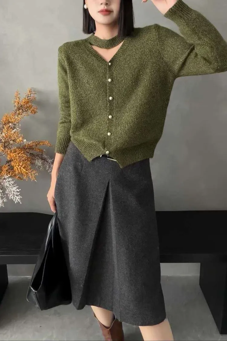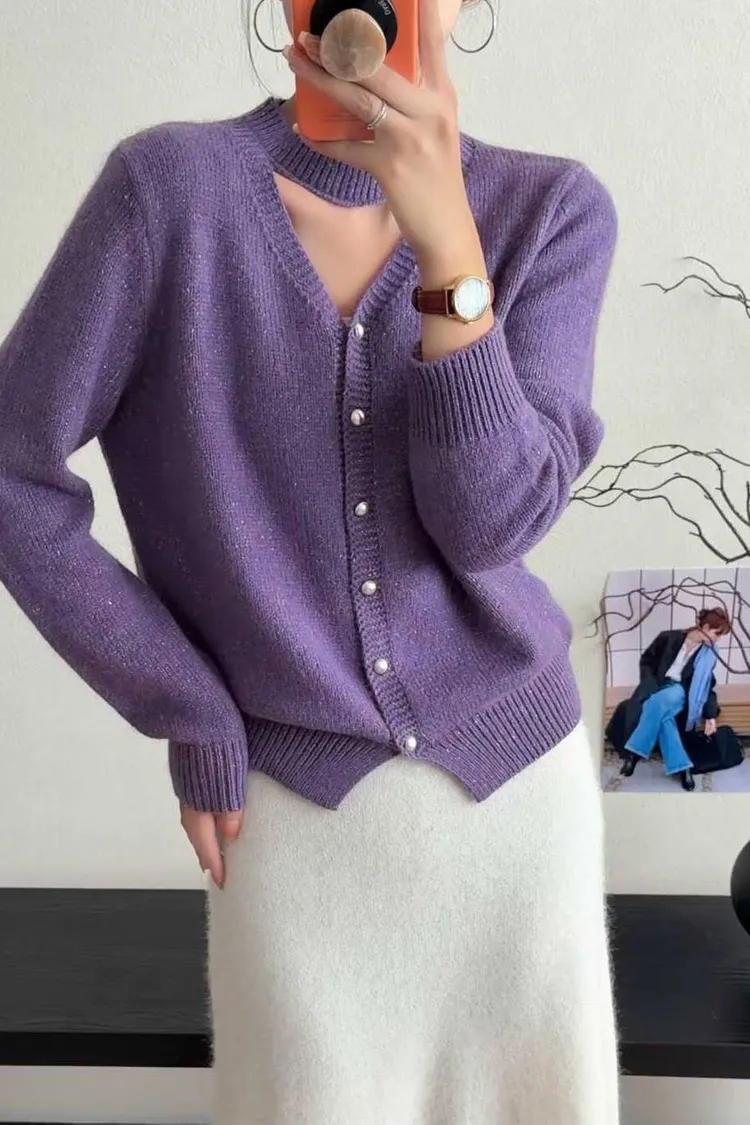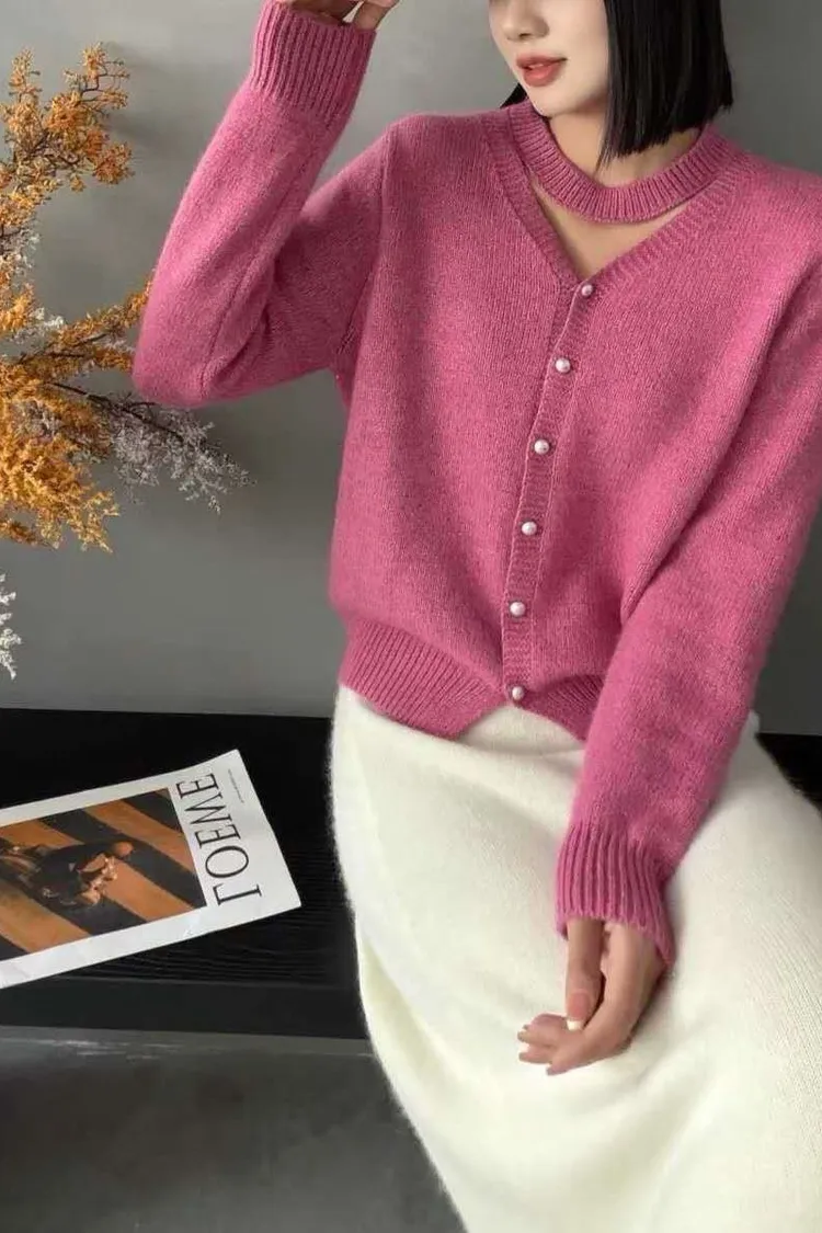 羊毛90%繞脖設計排釦針織上衣(紫,橘,粉,綠)
