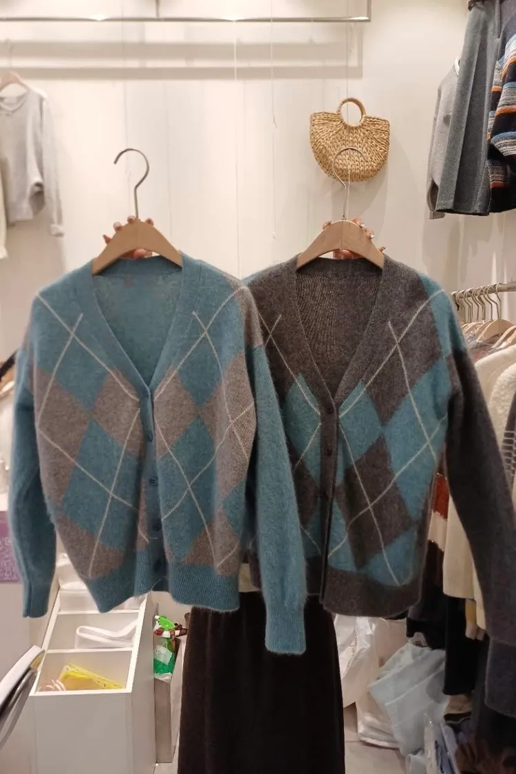 羊絨10%羊毛90菱格紋排釦針織上衣(藍,灰)