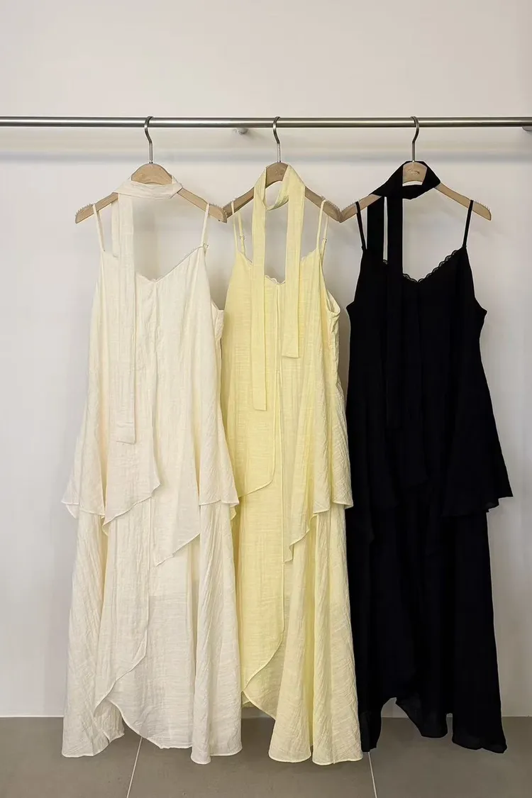 天絲3%人造絲63%漂亮滾邊輕飄飄洋裝(白,黃,黑)